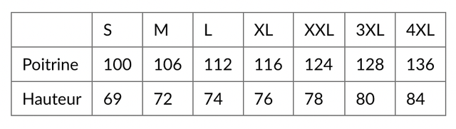 Guide des tailles (information : à partir du 3xl, un délai supplémentaire peut vous êtes précisé)
